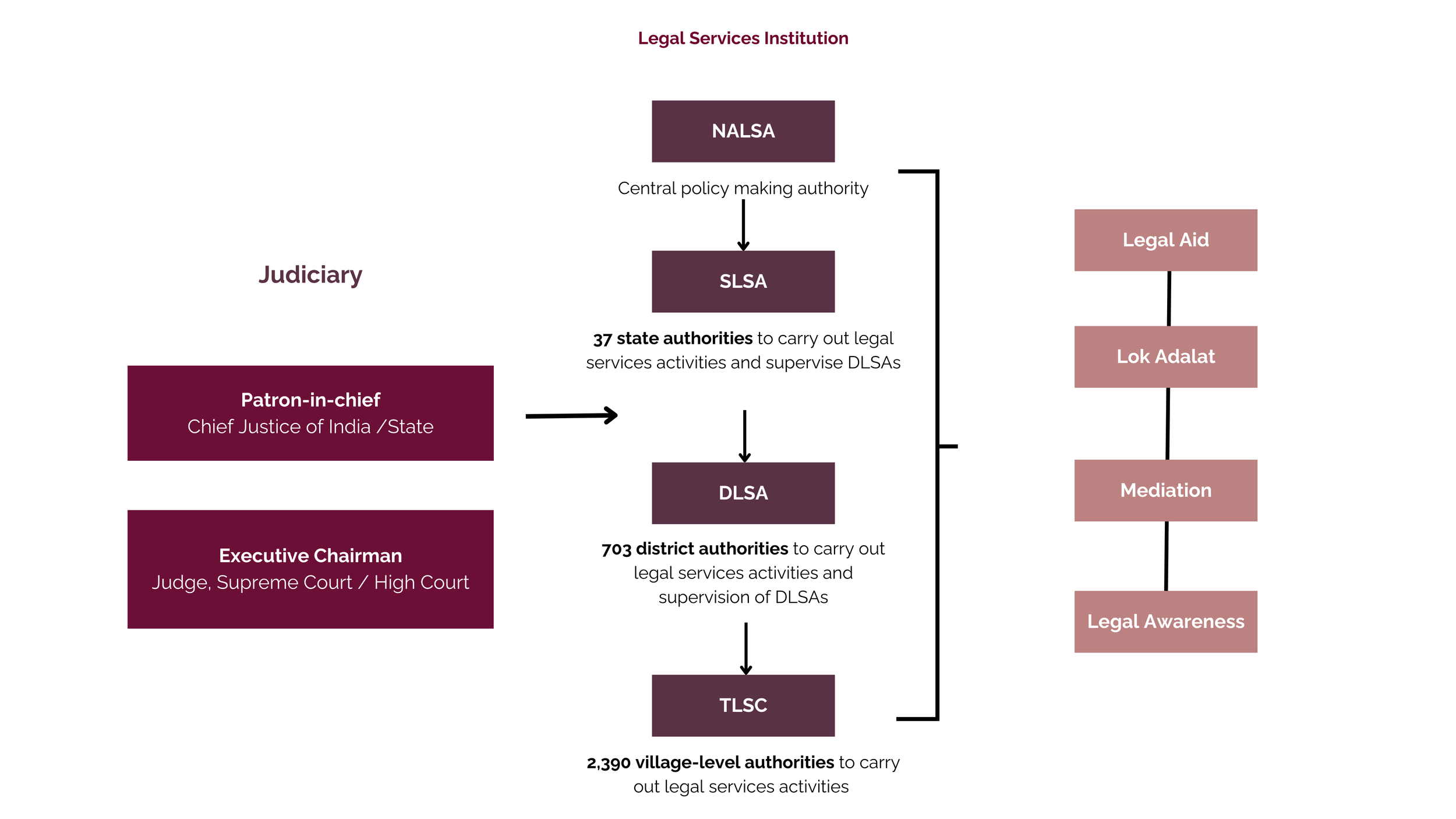 The core mandate of the SLSA is to give effect to the policies and directions of NALSA and to undertake a broad range of functions that contribute to the promotion of legal awareness and the delivery of free legal services. These are provided in the graphic on the bottom right: